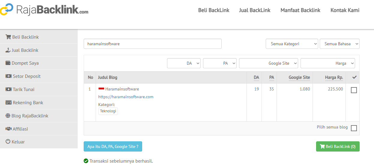 Sekarang untuk pemasangan backlink haramainsoftware, sudah tersedia RajaBacklink sehingga transaksi bisa lebih aman dan jelas informasi pembelian. Silahkan cari website haramainsoftware pada situs RajaBacklink 😀